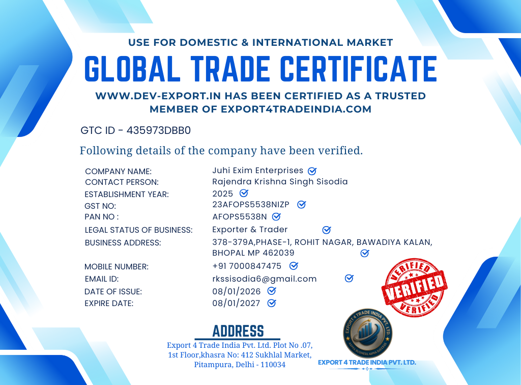 “Juhi Exim Enterprises supplies premium agro products with a focus on quality, freshness, and customer satisfaction worldwide.”